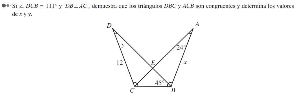 Como los triángulos son congruentes, sus ángulos correspondientes también lo son. Entonces, el ángulo x es congruente con el ángulo DCB, y el ángulo y es congruente con el ángulo BAC. Usando las propiedades de los ángulos internos de un triángulo, podemos hallar los valores de x y y: