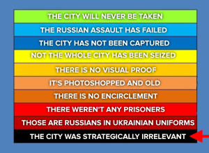 kek, no mames prieto...cual puta ciudad?! nadamas capturan asentamientos arrazados sin valor estrategico, la ultima ciudad importante que fue capturada fue bajmut y si no fuera por los traicionados wagner , no hubieran salido del "repliegue estrategico" en donde alli si para que veas tenian 2 ciudades de consideracion, actualmente solo dan mordiscos de tierra con puras hordas de carne. > y no de mujeres ukranianas que se mudaron a países europeos o a otros lados del mundo y abandonaron su país y estan cuckeando a sus esposos
