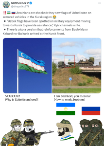 chale, no se que es peor; de que hayan embaucado y tener necesidad de los cogecabras uzbecos para que les vendan armamento o de que la "imparable" armada rusa no se pueda dar abasto...pero que se puede hacer o decir ante los que conquistaban el mundo en "dos semanas".kek