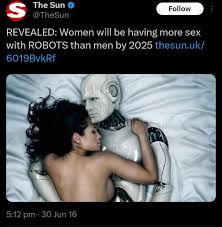 edit: ayy nooo, dice que las mujeres tendrán mas sexo con robots. chanfle. (Editado 46 segundos después.)