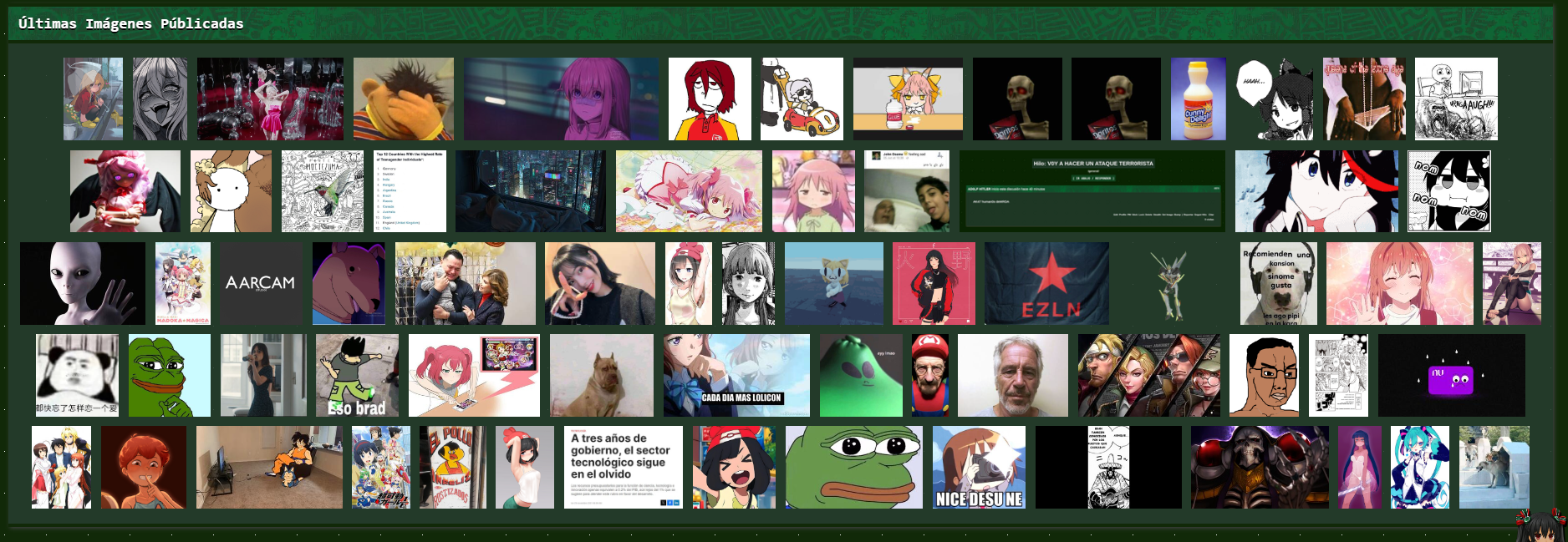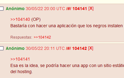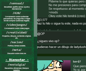 ira we,@4,045 (admin) se que es tu desmadre y tu proyecto, y esta chido we, pero al chile ya se empieza a sentir este lugar bien pinche hostil, ten mucho cuidado con la banda que quiere hacer de este lugar como 4chan o hispachan lleno de cosas densas y desagradables, ten cuidado we, por que al chile se puede ir a la chingada muy rapido este lugar si esta gente aprovecha este lugar para hablar de sus guarradas y otras cosas. un saludo y gracias por hacer este sitio. (Editado 43 segundos después.)
