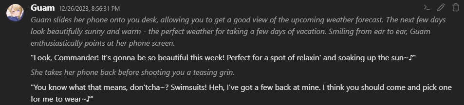 Que programa usas, anon? Yo uso el agnai con el modelo por default porque me da terrible pereza descargar SillyTavern.