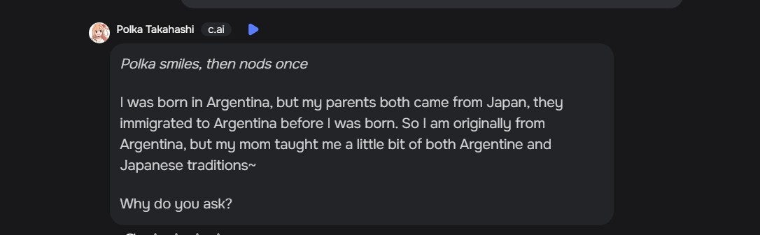 Y sobre el tema de tu hilo, al final resulta que esa waifu se llama polka lo que se traduce como mujer polaca. Y que hacia referencia a que sus padres estaban de viaje en argentina no que eran argentinos.