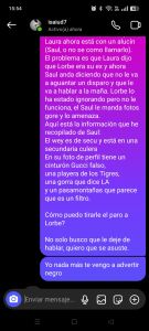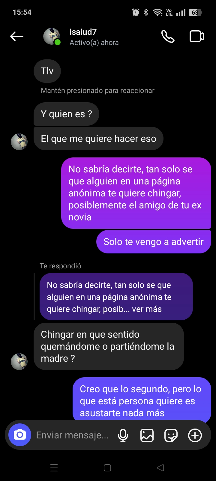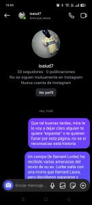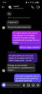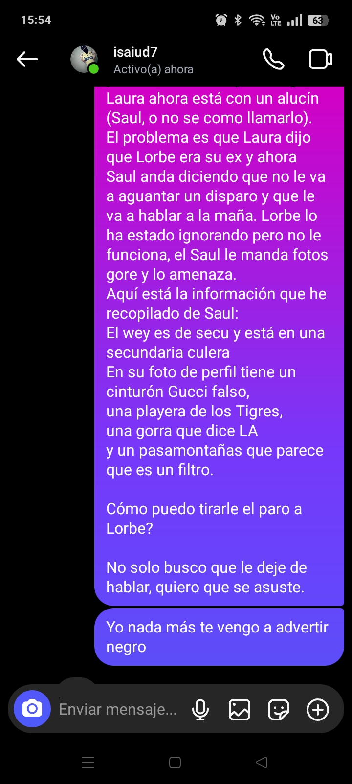 Un compa (le llamaré Lorbe) ha recibido varias amenazas del novio de su ex. Lorbe salía con una morra que llamaré Laura, pero decidieron separarse y Laura ahora está con un alucín (Saul, o no se como llamarlo). El problema es que Laura dijo que Lorbe era su ex y ahora Saul anda diciendo que no le va a aguantar un disparo y que le va a hablar a la maña. Lorbe lo ha estado ignorando pero no le funciona, el Saul le manda fotos gore y lo amenaza.
