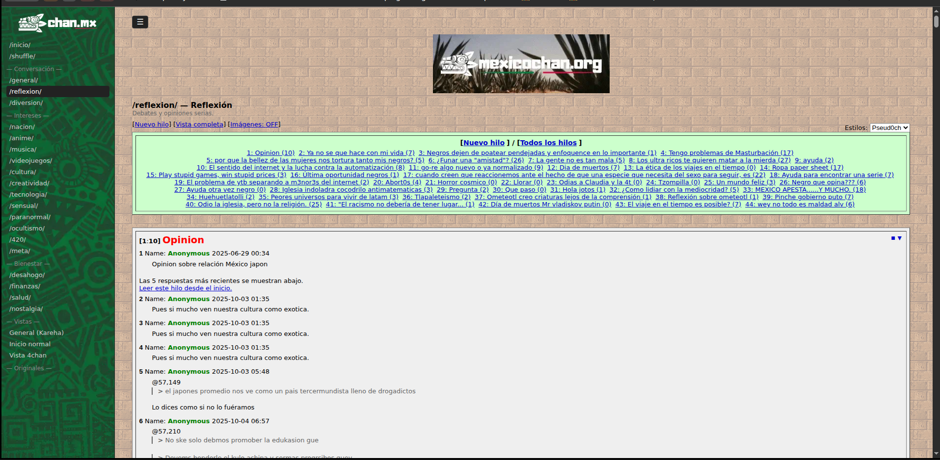 si hay una tradicón de poner tremas de otros chanes relevantes etnre chanes. La mayoria tiene yotsube y yotsube 2 por que son los de 4chan. Casí todos los que han existido en español traen el estilo Secta por que es el tema del primer chan hispano que existio (sectachan).