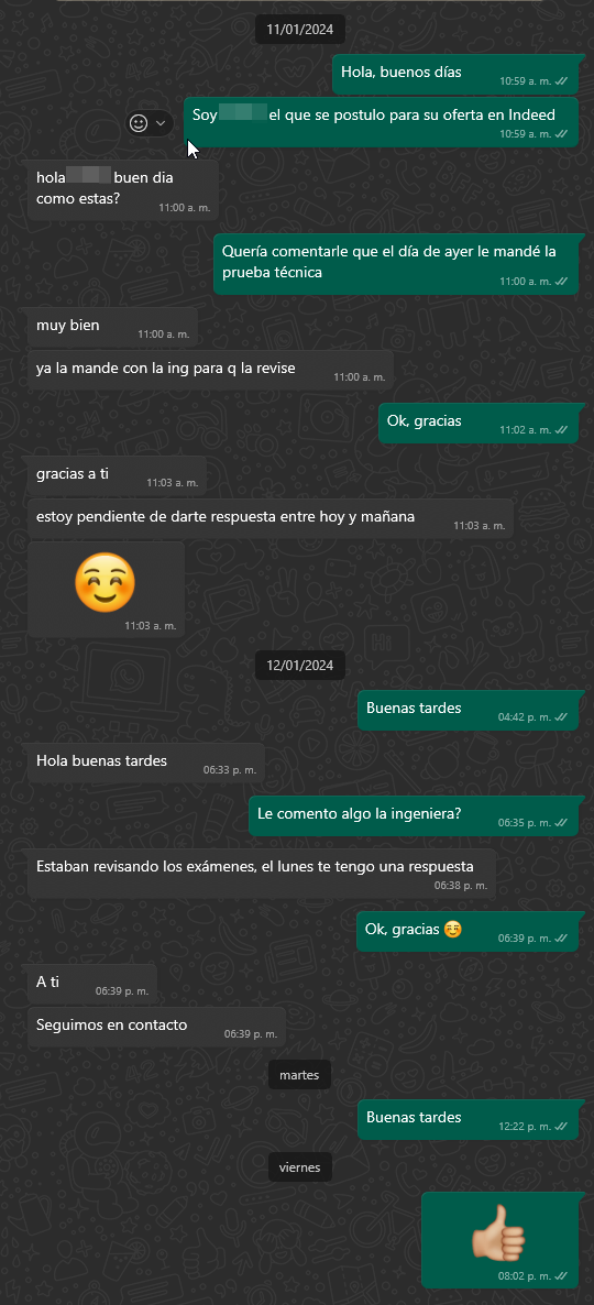 Por otro lado contacte con otras empresas, una empresa de desarrollo de software (mas maquila de software que otra cosa), y llevo esperando una respuesta desde hace 15 días. Tuve entrevista presencial, hasta en ingles y pues tardaron 3 días en mandarme la prueba técnica la cual me mandaron casi a la hora en la que salen y pues la mande. Y la de RH nomas nada. La verdad es un poco molesto esto de tener que ir hasta la recontra gastando gasolina y tiempo.